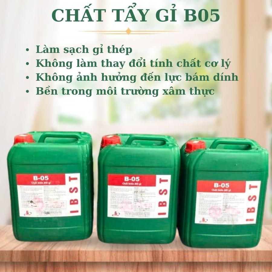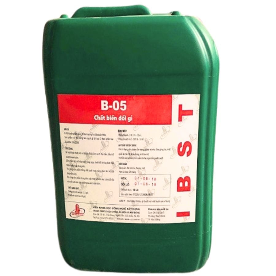 Chất tẩy gỉ sét B05 Can 10 Lít chuyên dụng để xử lý bề mặt sắt thép bị gỉ sét. Có dạng lỏng, màu xanh nhạt, thành phần gồm Polyphenol và các chất phụ trợ khác không chứa ion Cl-. B-05 – Chất tẩy gỉ (rỉ) phản ứng hoá học với gỉ thép tạo thành màng thụ động có tính chất trơ và bền vững