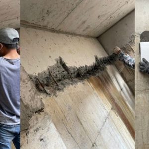Khi kết cấu ở điều kiện khô ráo. Cần đục loại bỏ các vị trí bê tông kém chất lượng, bê tông rỗ, tổ ong và thay thế chúng bằng vữa rót bù co ngót. Tham khảo Sika grout 214-11, sika grout GB.