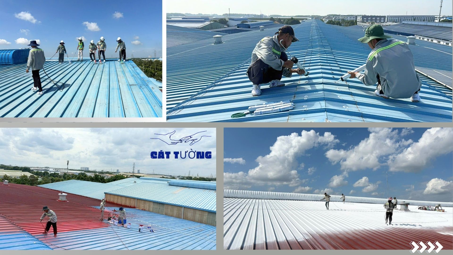 - Vệ sinh bề mặt mái Tôn bằng máy xịt nước áp lực cao kết hợp với các dụng cụ lau chùi. Đây là công tác quan trọng nhất theo quan điểm của Cát Tường. Vì chỉ khi bề mặt sach sẽ thì các lớp sơn mới bám dính tốt nhất và không bong rộp theo thời gian, từ đó nâng cao tuổi thọ cho toàn bộ hệ thống Sơn.